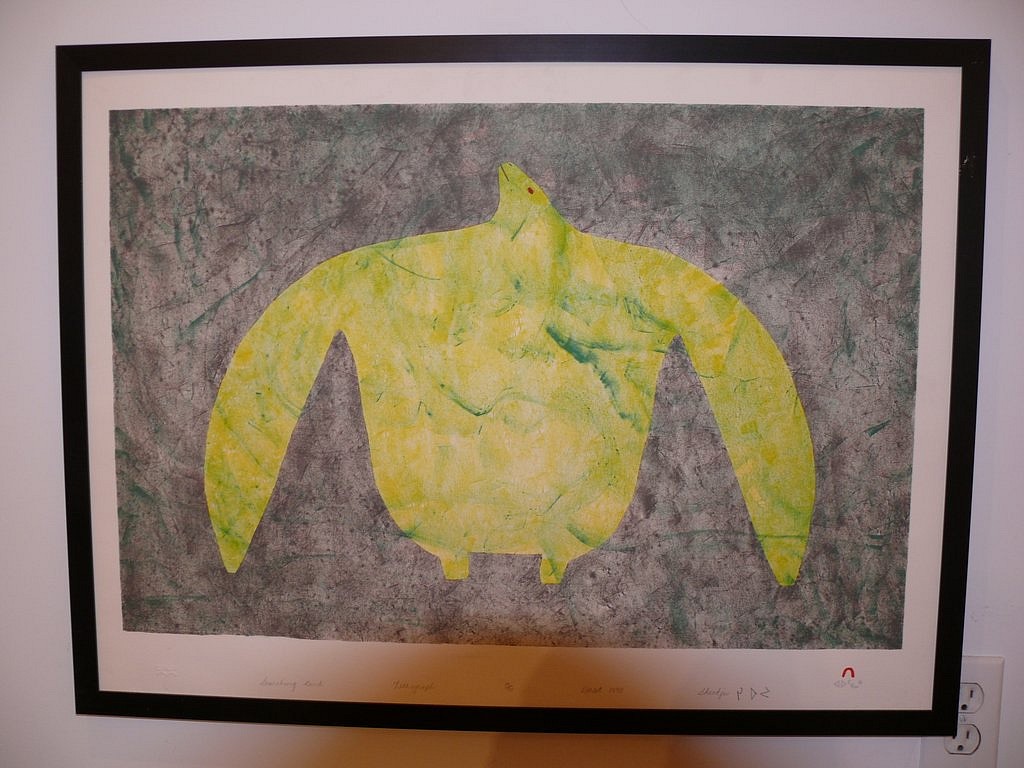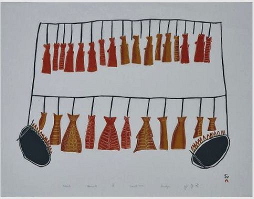 Sheojuk Etidlooie's graphics frequently are highly abstracted. This print, in contrast, is quite realistic, with the bone structure of the individual pieces of drying char depicted clearly. However, the overall impression is an abstraction, with the char isolated from their surroundings.